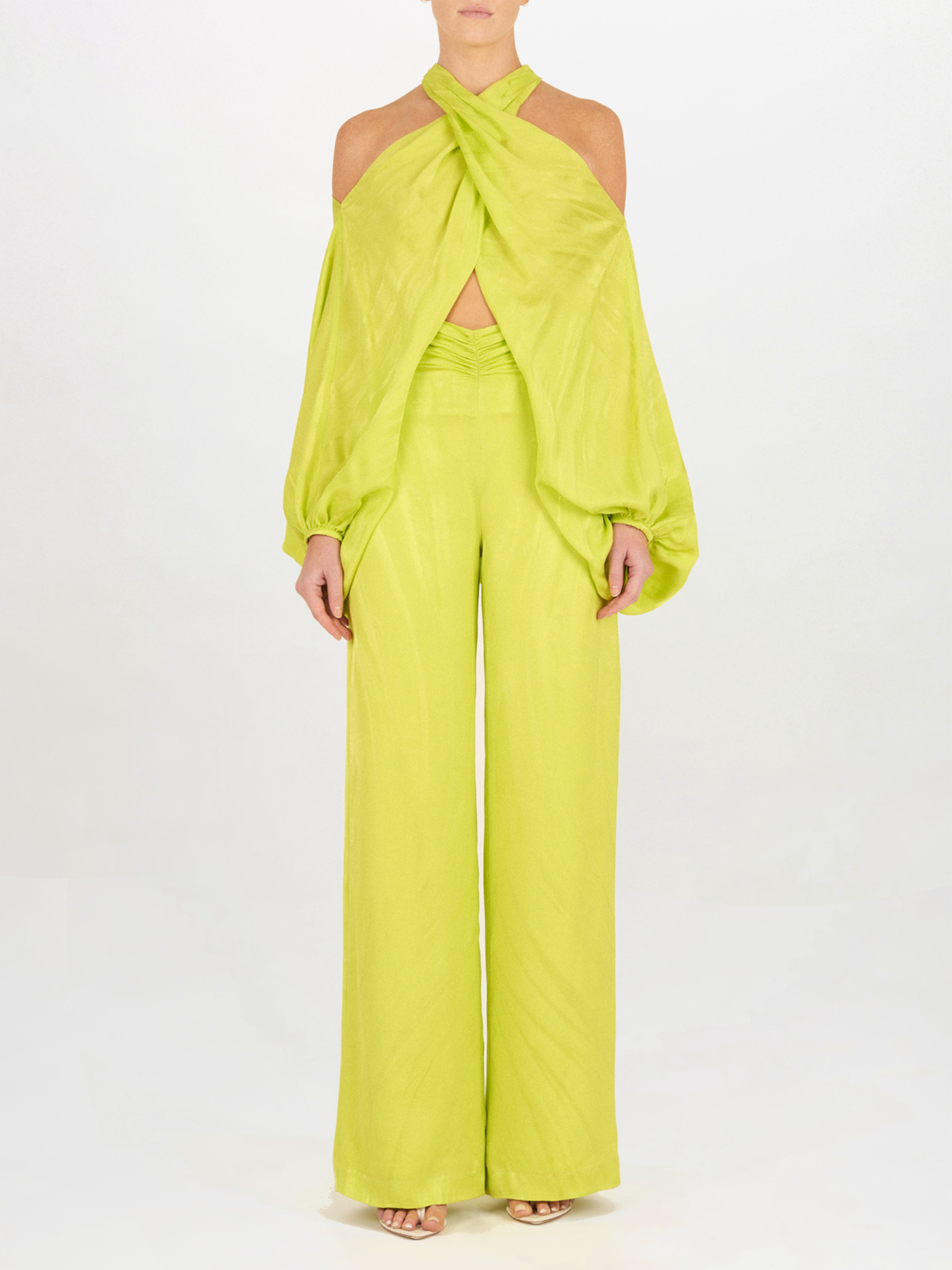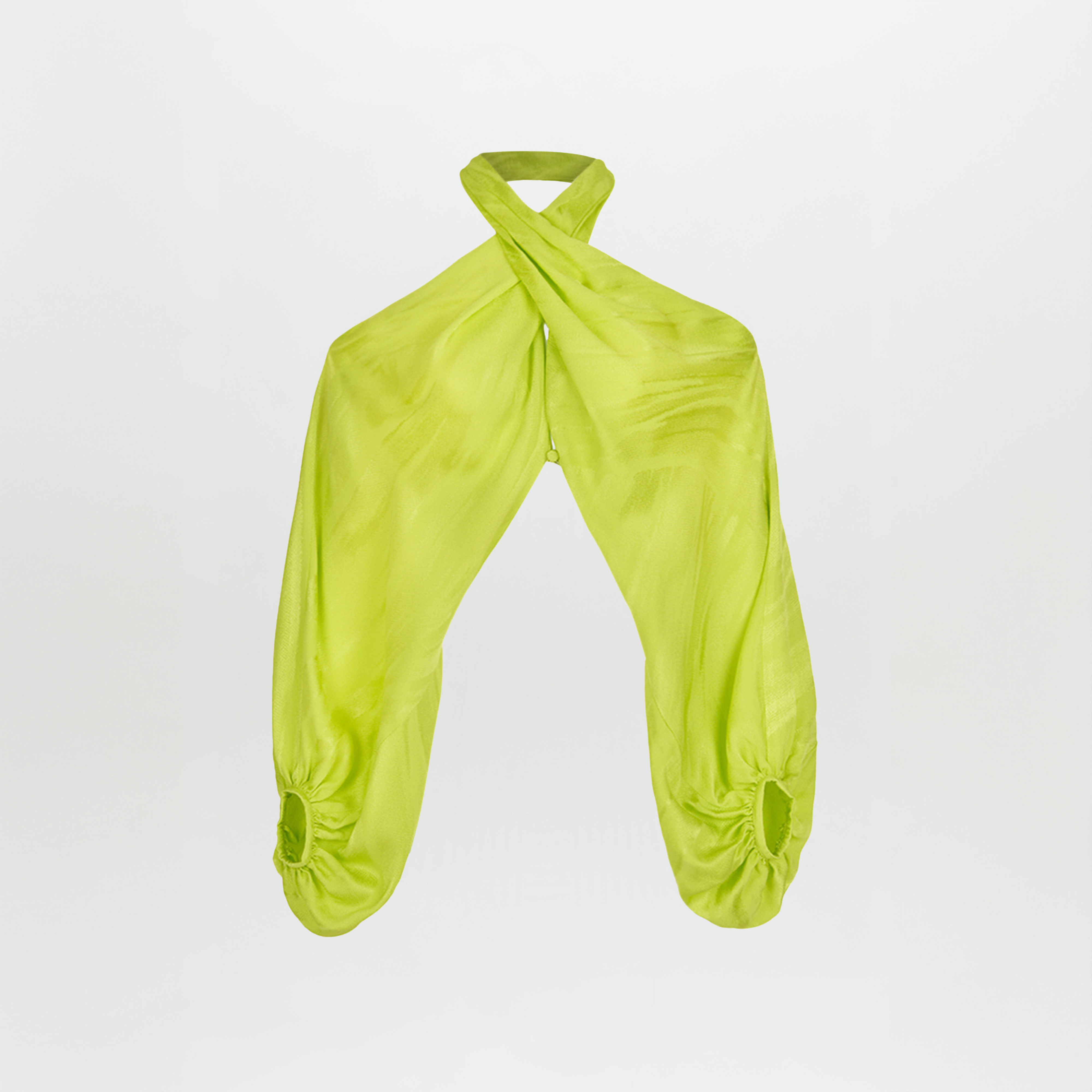 A stunning style, with a beautiful abstract fuschia lime striped print, we present the Juno blouse. The modern high fashion top has a playful silhouette constructed by two panels that drape and make up the sleeves. It features exposed shoulders, long dolman sleeves, and a twist halter style that goes around the neck. The innovative jacquard piece is crafted thoughtfully in a unique verde lime hue.